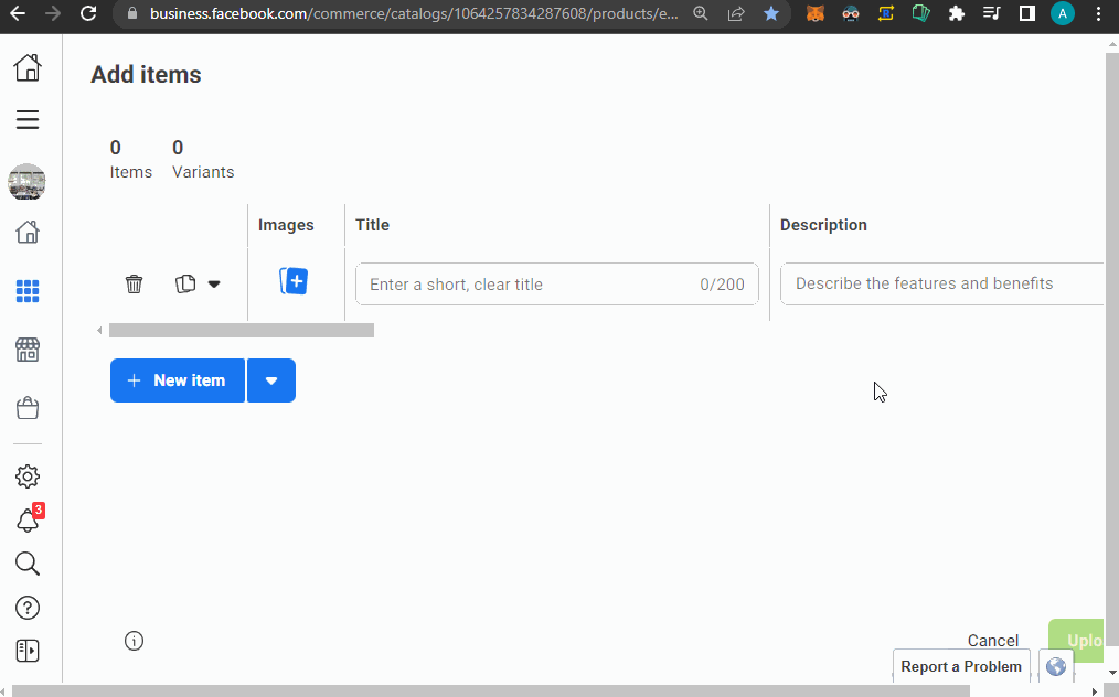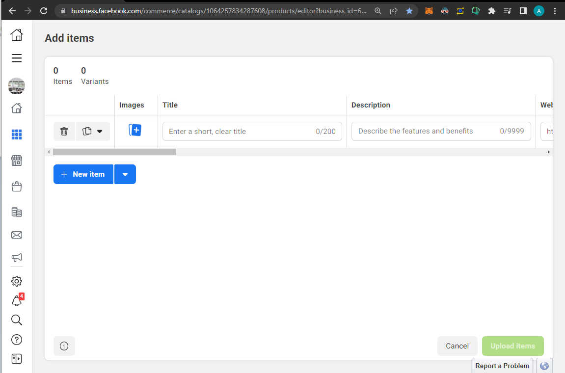 - Navigate to the catalog of your Facebook Commerce shop. This is where you upload new items manually. It should look something like this.