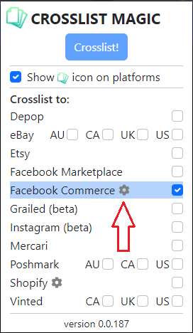 - While on the catalog, open the extension settings and click on the cog icon next to Facebook Commerce.